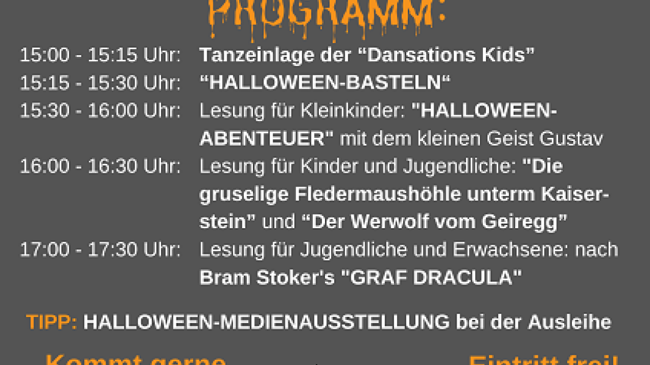 Die Stadtbücherei Mürzzuschlag ladet heuer bereits zum 4. Mal zum gruuuuseligen "HALLOWEEN-SPECIAL" ein, das Büchereiteam freut sich schon sehr auf euer Kommen! - Besucht uns gerne in eurem Grusel-Outfit!
