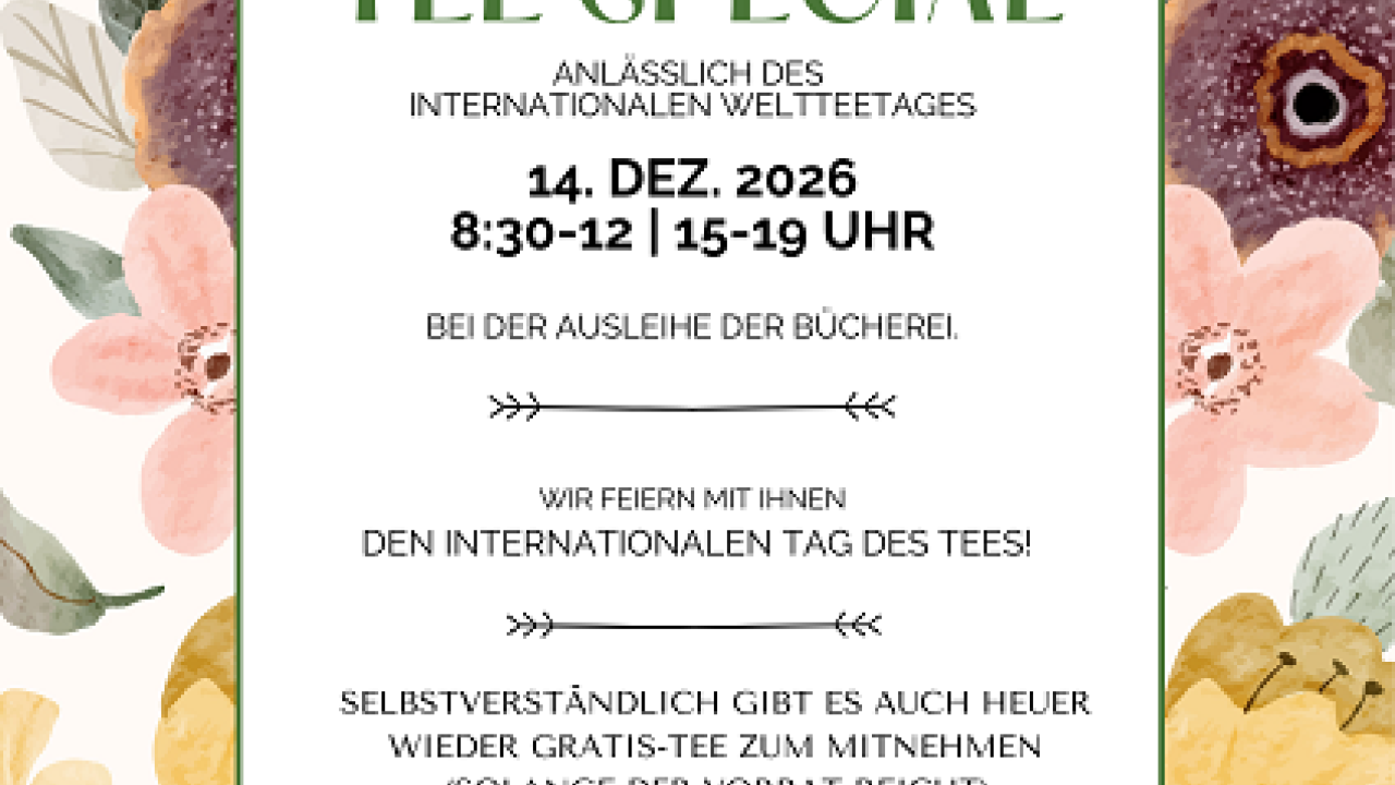 5. Tee-Special in der Stadtbücherei Mürzzuschlag anlässlich des weltweit gefeierten INTERNATIONALEN TEE-TAGES. - Natürlich gibt es auch dieses Mal wieder einen GRATIS-TEEBEUTEL für zu Hause zum Mitnehmen (solange der Vorrat reicht).